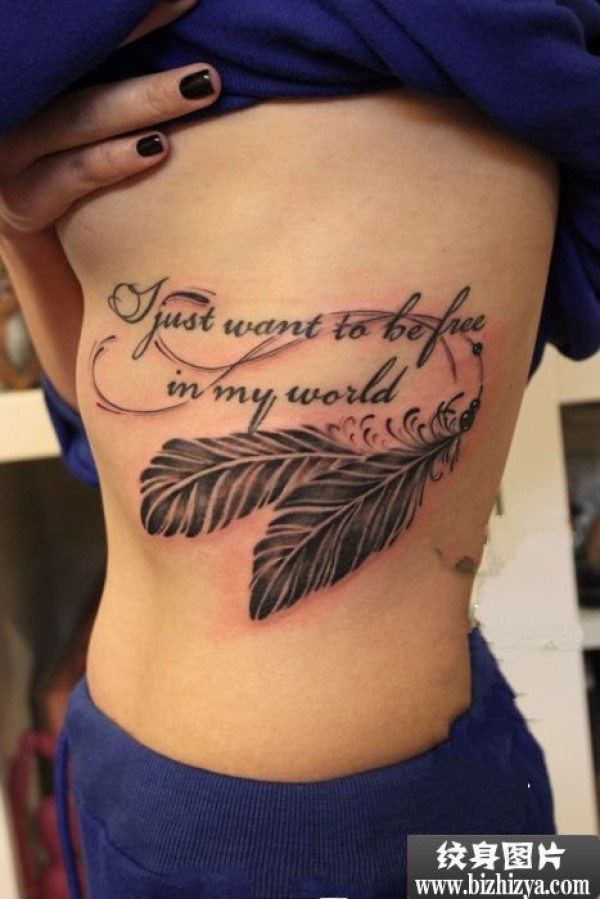 英文叠加羽毛胸侧纹身图案图片_英文纹身图案大全_纹身图吧