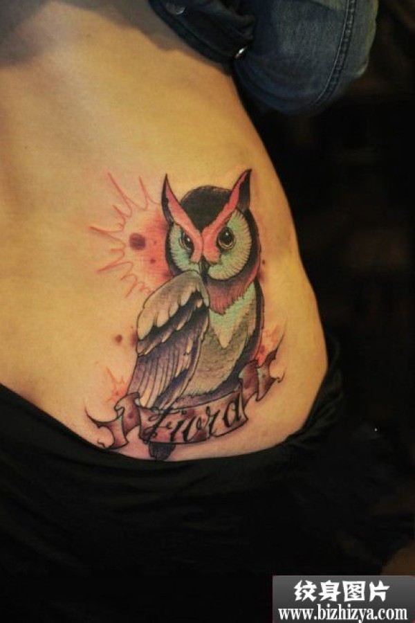 腰部创意猫头鹰英文刺青图案图片_英文纹身图案大全_纹身图吧