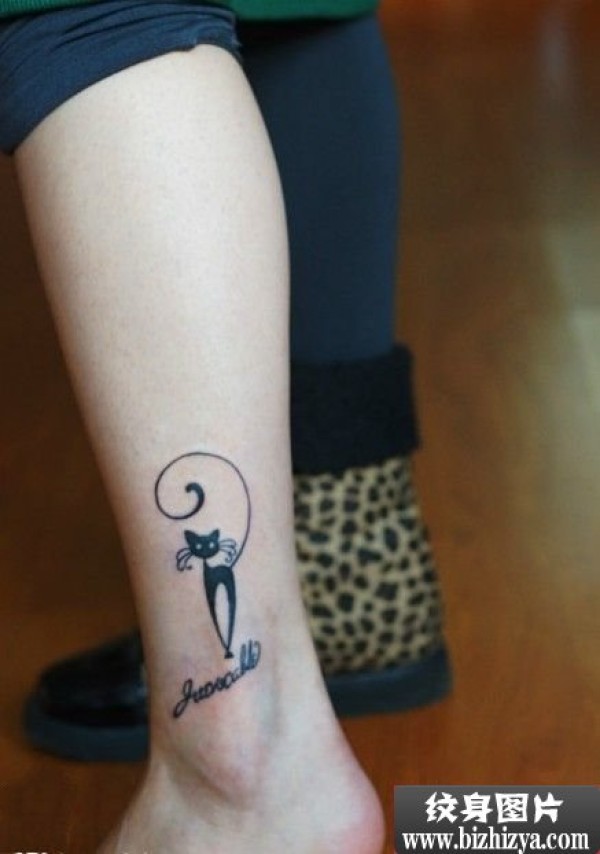 小黑猫英文腿部纹身图案图片_英文纹身图案大全_纹身图吧