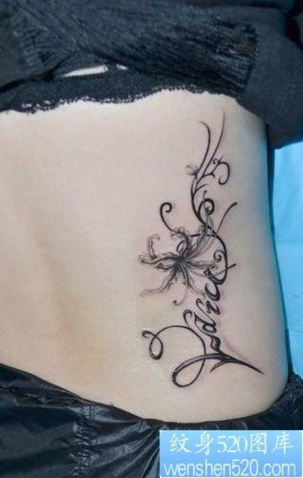 美女腰部精美的彼岸花与字母纹身图片_字母纹身图案大全_纹身图吧