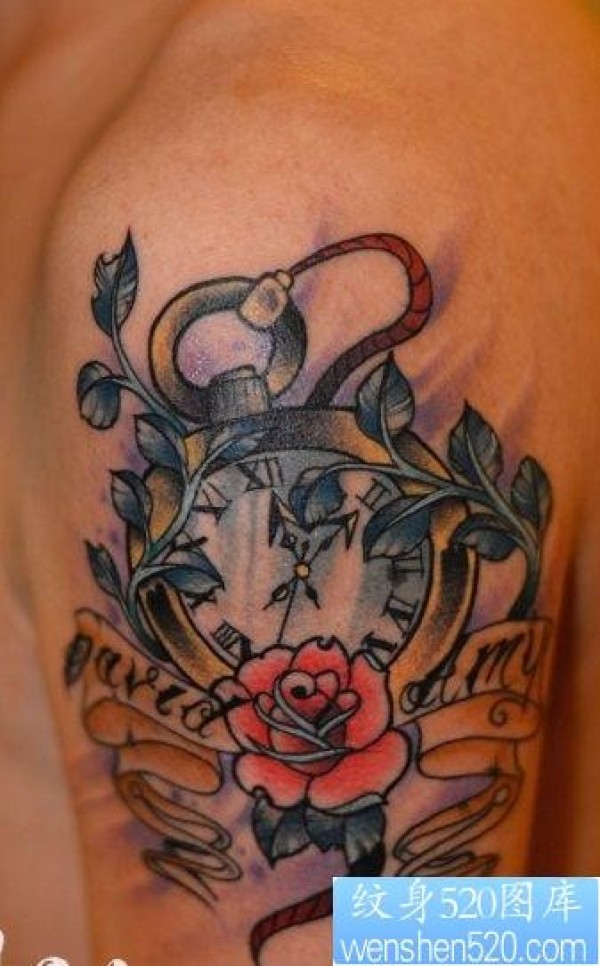 一幅手臂时钟字母文身图片由纹身520图库推荐_字母纹身图案大全_纹身图吧