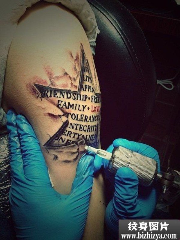 手臂撕皮个性五角星字母纹身现场图案图片_字母纹身图案大全_纹身图吧
