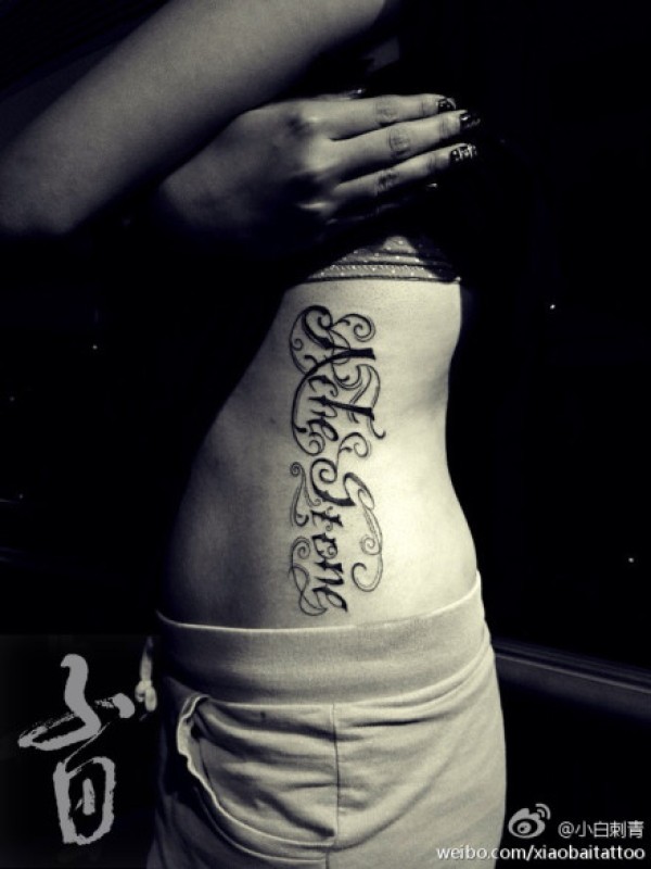 美女侧腰潮流经典的花体字母纹身图案_字母纹身图案大全_纹身图吧
