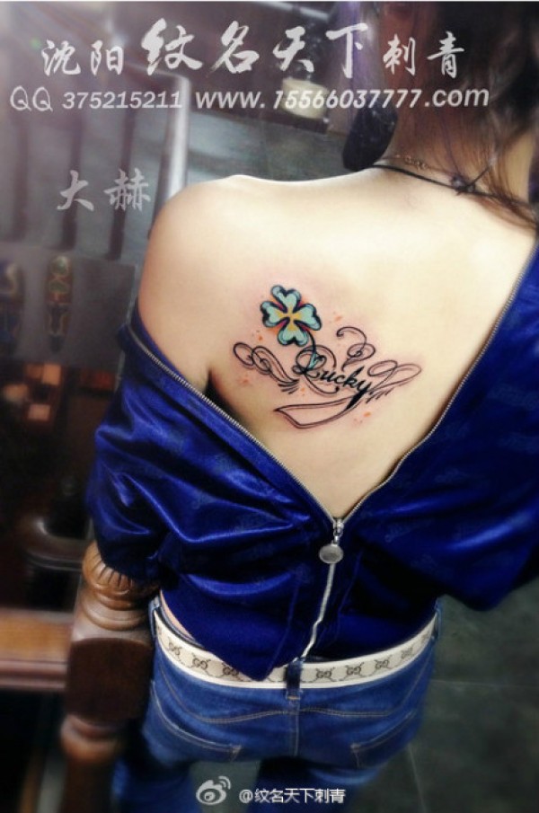 女生后背唯美时尚的四叶草与字母纹身图案_字母纹身图案大全_纹身图吧