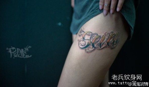 女生大腿处潮流唯美的彩色花体字母纹身图案_字母纹身图案大全_纹身图吧