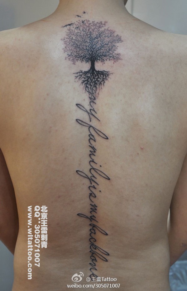 背部时尚流行的小树与脊椎字母纹身图案_字母纹身图案大全_纹身图吧