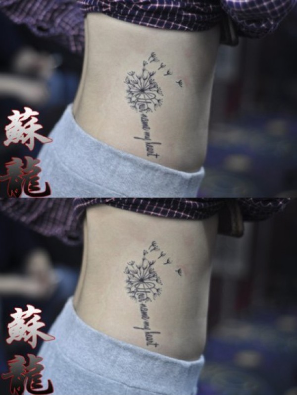 女生腰部小巧时尚的蒲公英与字母纹身图案_字母纹身图案大全_纹身图吧