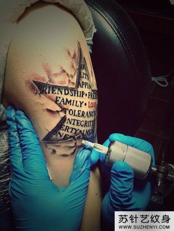 手臂撕皮五角星字母纹身_字母纹身图案大全_纹身图吧