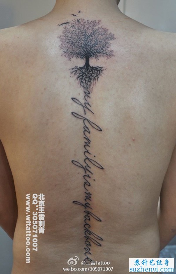 背部小树与脊椎字母纹身_字母纹身图案大全_纹身图吧