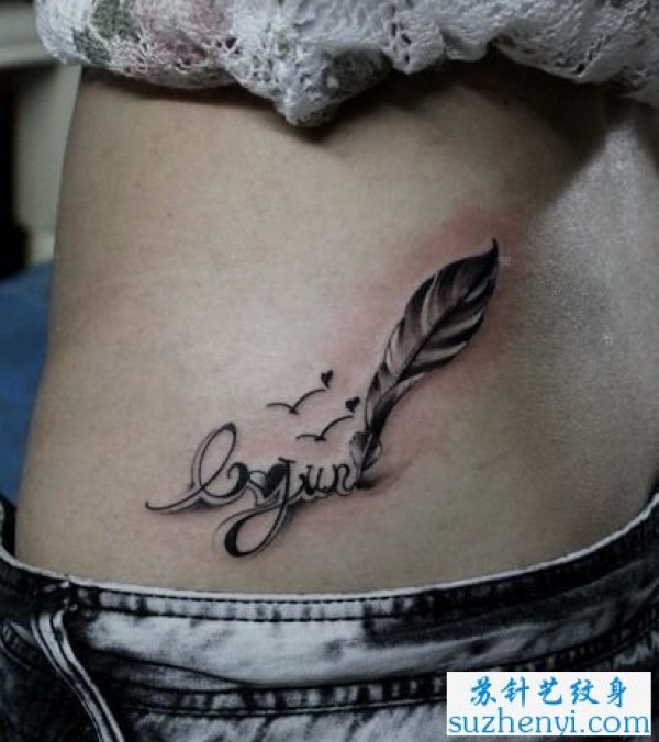 腰部羽毛与字母纹身_字母纹身图案大全_纹身图吧