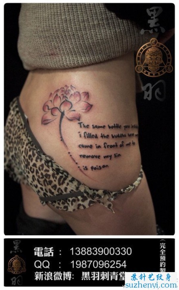 腰部水墨莲花与字母纹身_字母纹身图案大全_纹身图吧