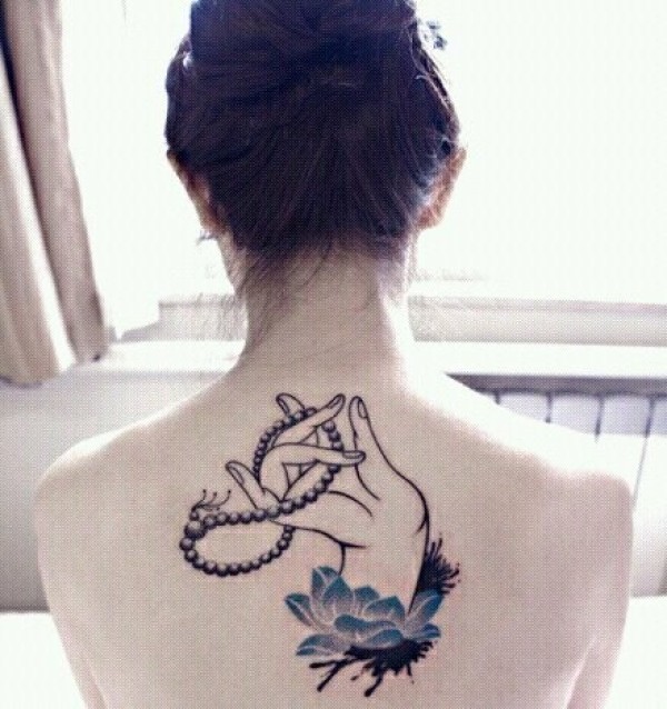 女孩背部手拿佛珠刺青_宗教纹身图案大全_纹身图吧