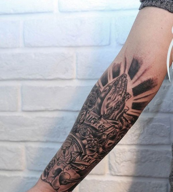 大臂上一组老人祈祷手纹身作品_宗教纹身图案大全_纹身图吧