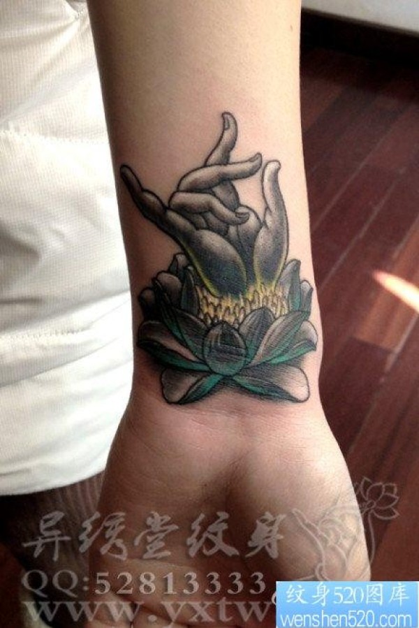 女人手腕处精美好看的佛手与莲花纹身图片_宗教纹身图案大全_纹身图吧