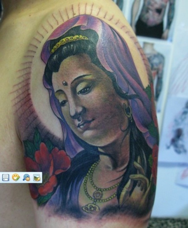 男士大臂上的彩色观音人物头像纹身图案_宗教纹身图案大全_纹身图吧