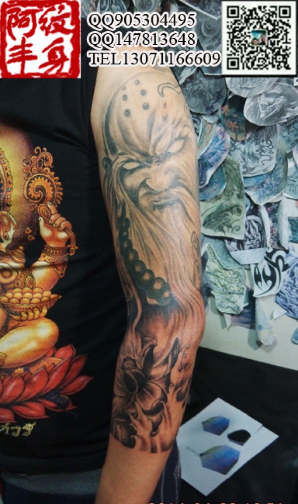 臂膀上带衬托图案的罗汉纹身图带素色荷花图案_宗教纹身图案大全_纹身图吧