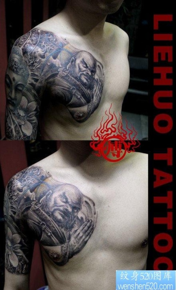 超帅经典的半甲达摩与佛头纹身图片_宗教纹身图案大全_纹身图吧
