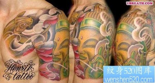 半甲纹身图片彩色半胛佛头佛像鲤鱼纹身图片_宗教纹身图案大全_纹身图吧