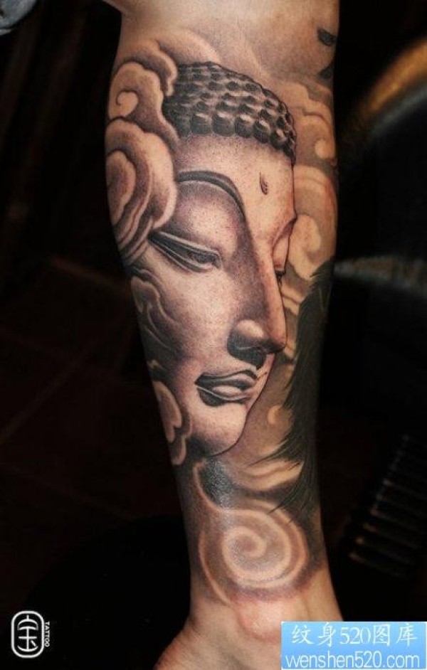 男生腿部前卫经典的石雕佛头纹身图片_宗教纹身图案大全_纹身图吧