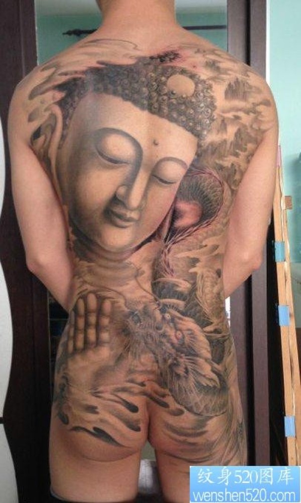 霸气超酷的男生背部满背佛头与龙纹身图片_宗教纹身图案大全_纹身图吧