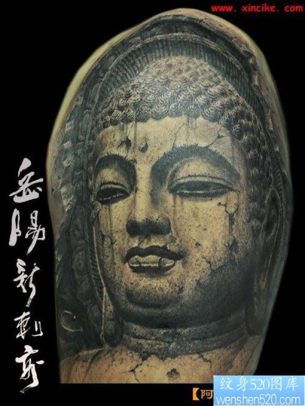 男生手臂经典时尚的石雕佛头纹身图片_宗教纹身图案大全_纹身图吧