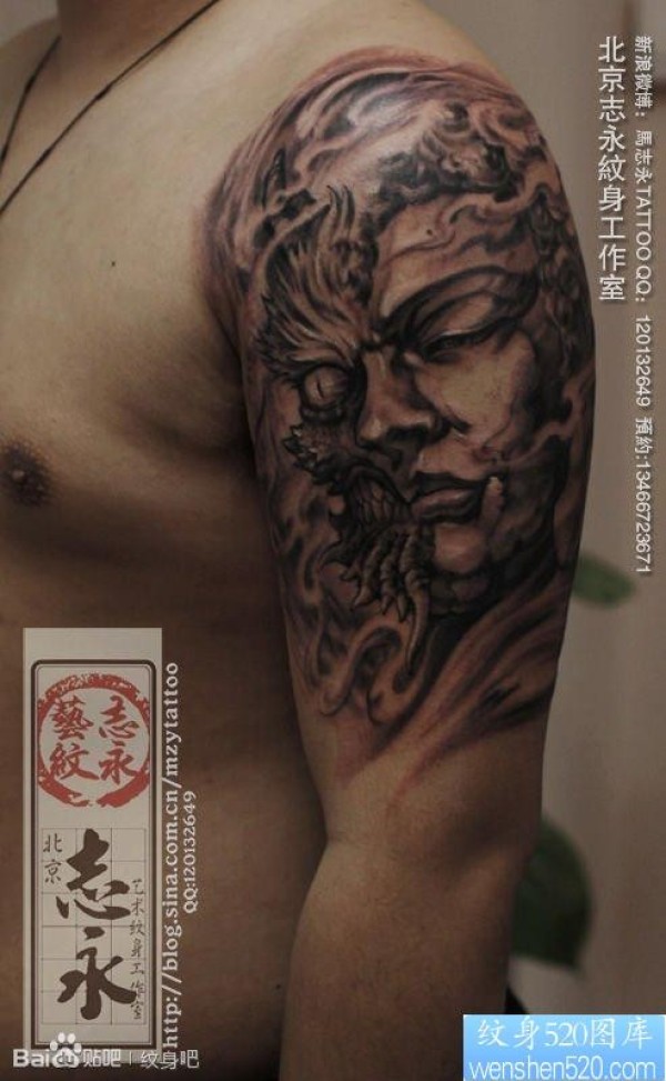男生手臂很酷的一半恶魔一般佛头纹身图片_宗教纹身图案大全_纹身图吧