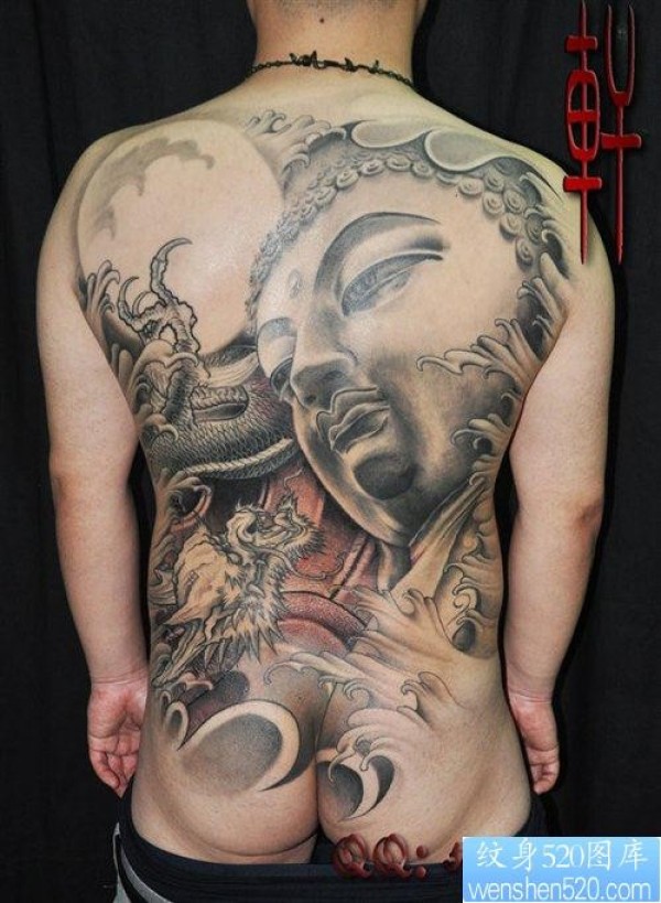满背黑灰佛头与龙纹身图片_宗教纹身图案大全_纹身图吧