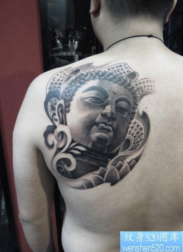 男生背部经典的黑灰佛头纹身图片_宗教纹身图案大全_纹身图吧