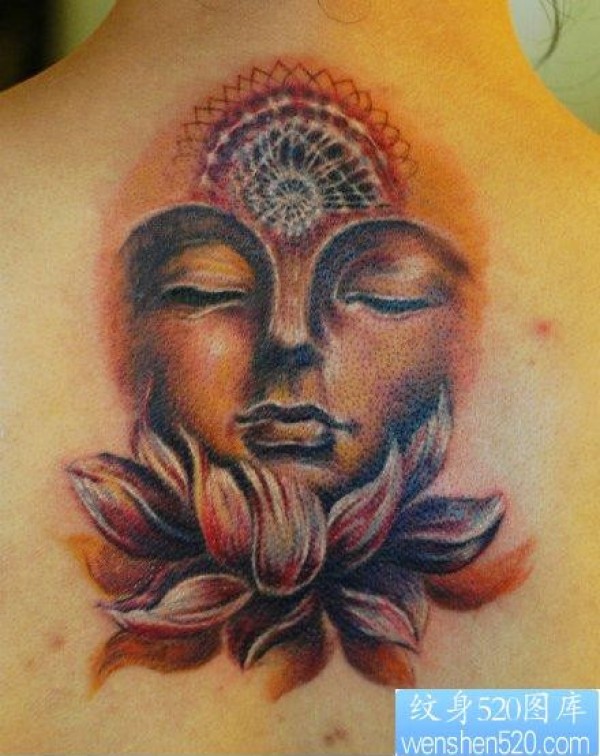 背部经典的彩色佛头纹身图片_宗教纹身图案大全_纹身图吧