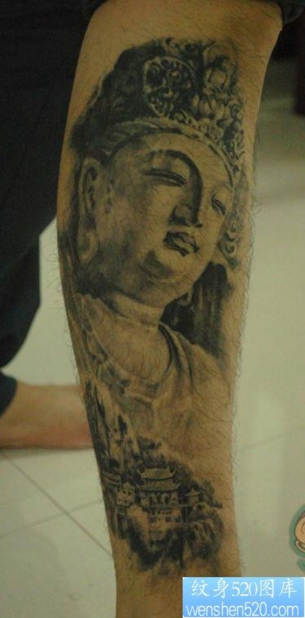 腿部经典的观音石雕纹身图片_宗教纹身图案大全_纹身图吧