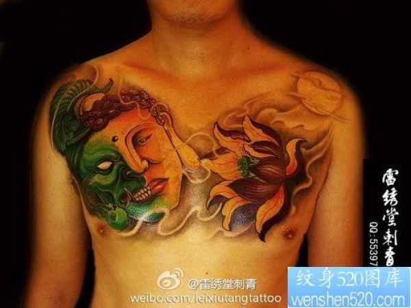 男性前胸超酷的佛头与莲花纹身图片_宗教纹身图案大全_纹身图吧