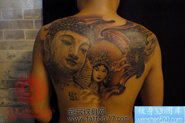 背部经典帅气的佛头花旦纹身图片_宗教纹身图案大全_纹身图吧