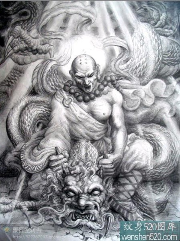 霸气的降龙罗汉纹身手稿图_宗教纹身图案大全_纹身图吧