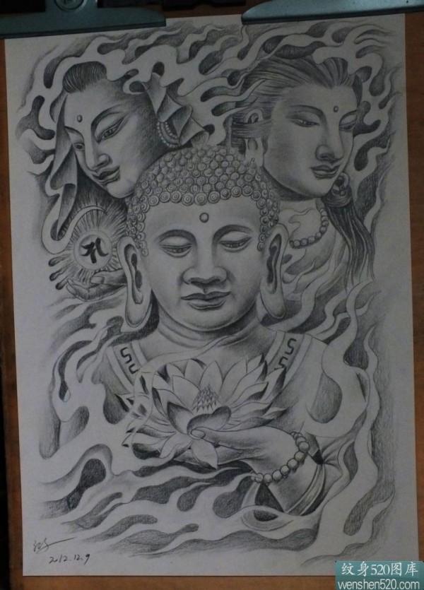 黑白色佛祖捧莲纹身手稿_宗教纹身图案大全_纹身图吧
