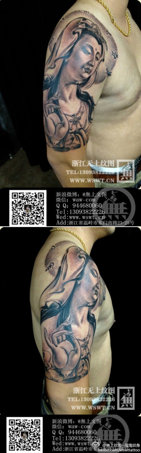 手臂经典的黑灰观音菩萨纹身图案_宗教纹身图案大全_纹身图吧