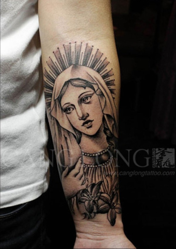 手臂潮流时尚的圣母玛利亚纹身图案_宗教纹身图案大全_纹身图吧
