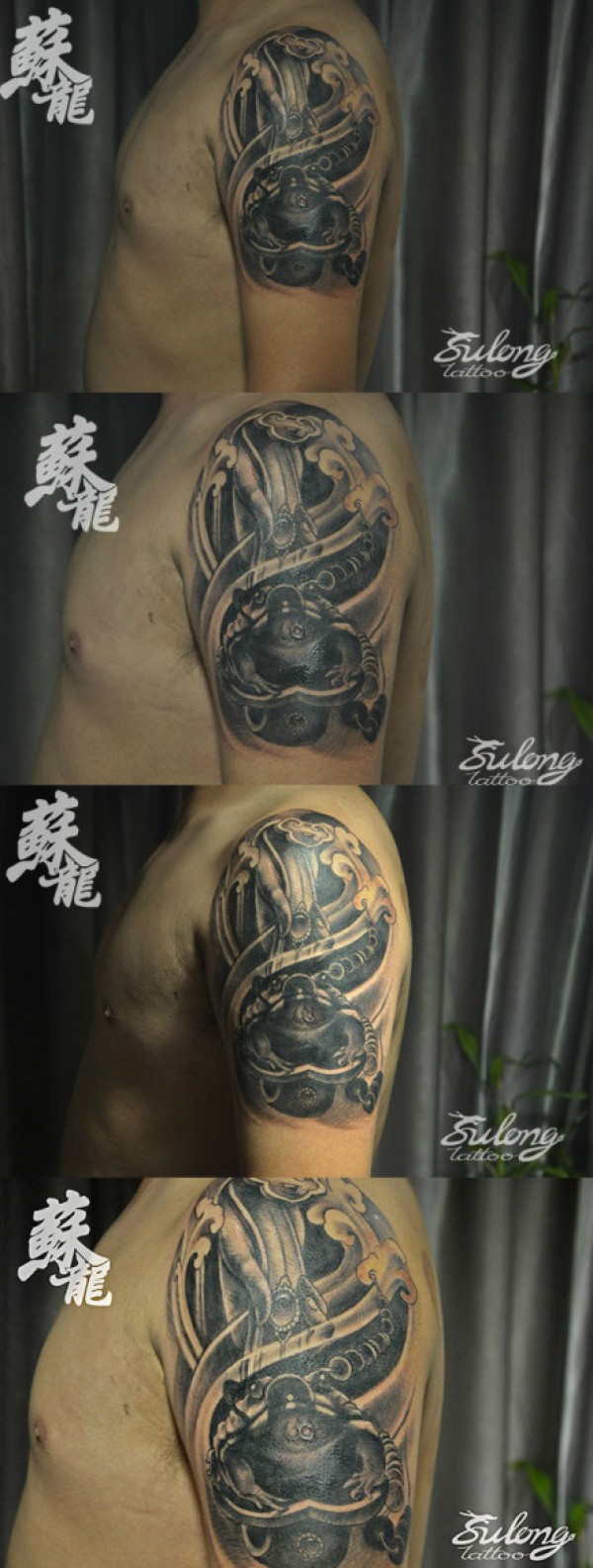 手臂经典的黑灰佛手如意金蟾纹身图案_宗教纹身图案大全_纹身图吧