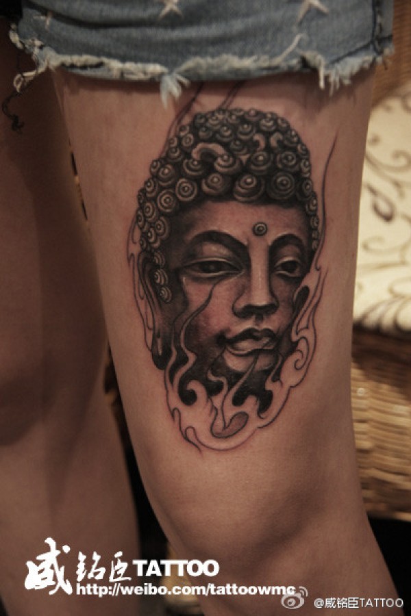 美女腿部经典很酷的黑灰佛头纹身图案_宗教纹身图案大全_纹身图吧