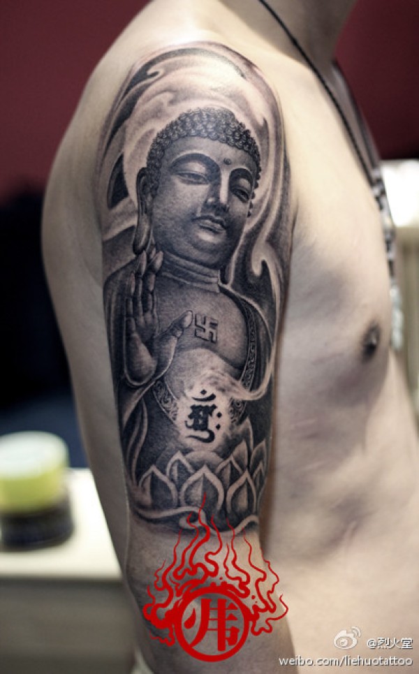 男生手臂时尚很酷的黑灰佛头纹身图案_宗教纹身图案大全_纹身图吧