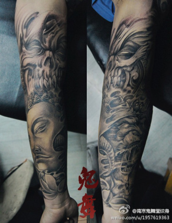 手臂潮流经典的佛头与恶魔纹身图案_宗教纹身图案大全_纹身图吧