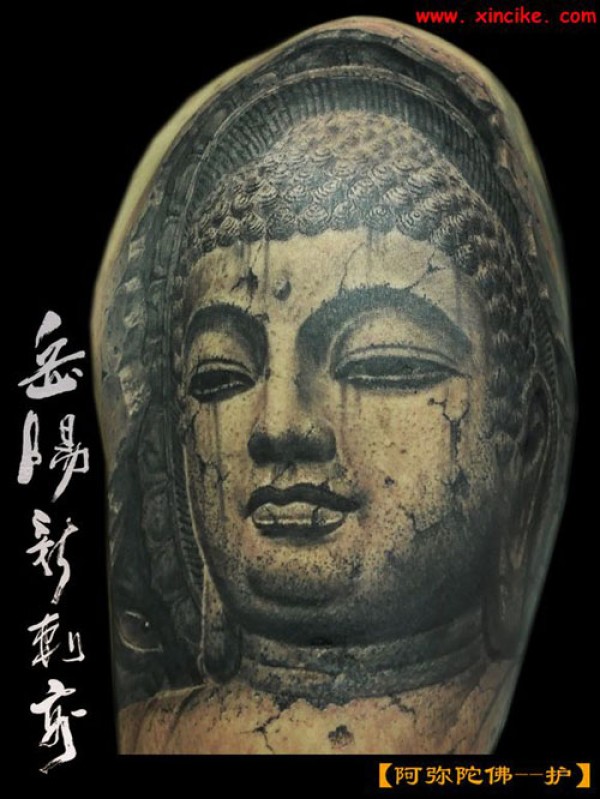 男人手臂超酷经典的石雕佛头纹身图案_宗教纹身图案大全_纹身图吧
