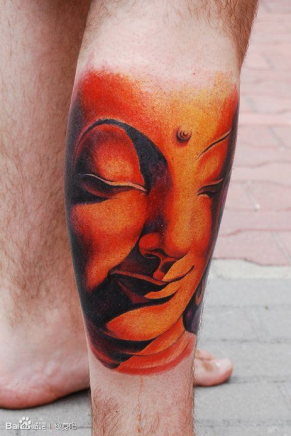 腿部经典流行的彩色佛头纹身图案_宗教纹身图案大全_纹身图吧