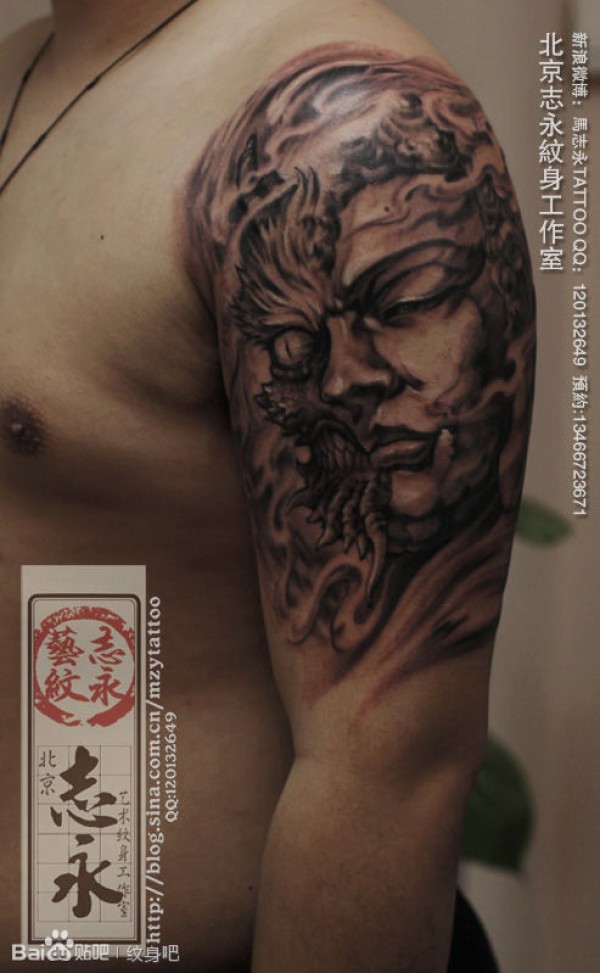 男人手臂超帅的恶魔与佛头纹身图案_宗教纹身图案大全_纹身图吧