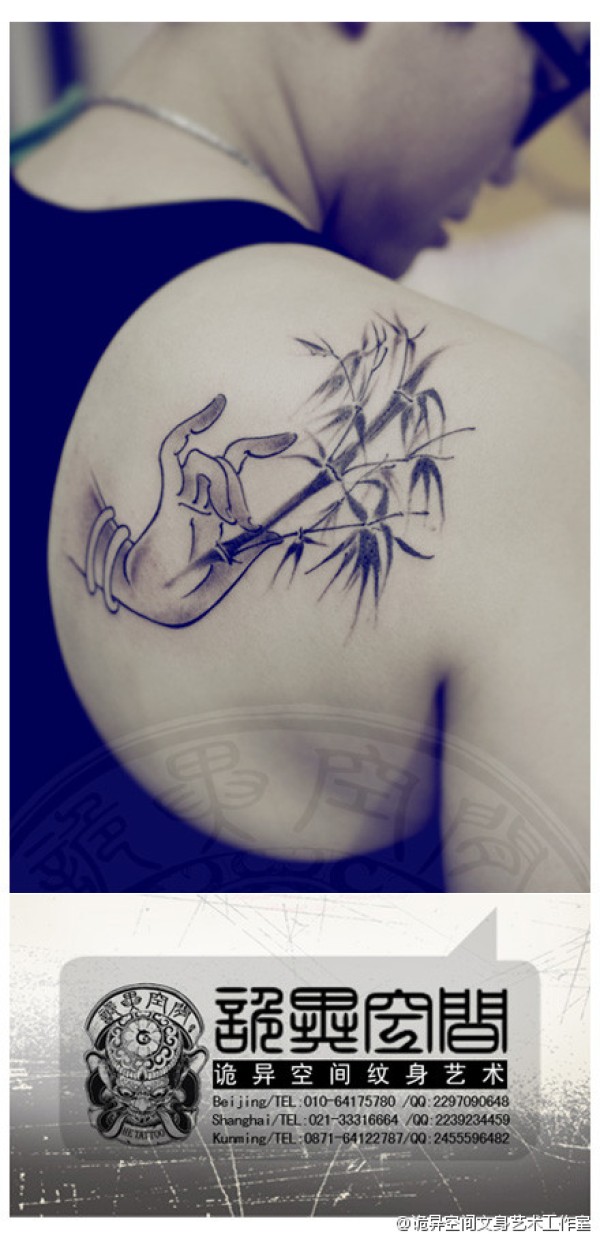 男生肩背时尚经典的佛手与竹子纹身图案_宗教纹身图案大全_纹身图吧