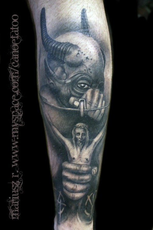 腿部经典另类的恶魔与耶稣纹身图案_宗教纹身图案大全_纹身图吧