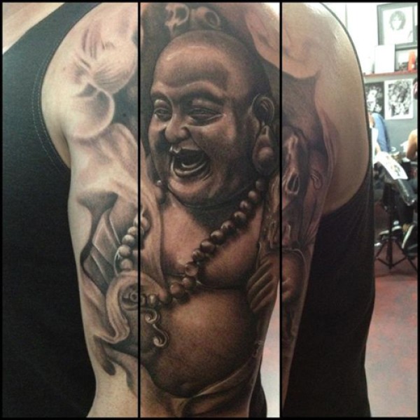 手臂一款笑哈哈的弥勒佛纹身图案_宗教纹身图案大全_纹身图吧