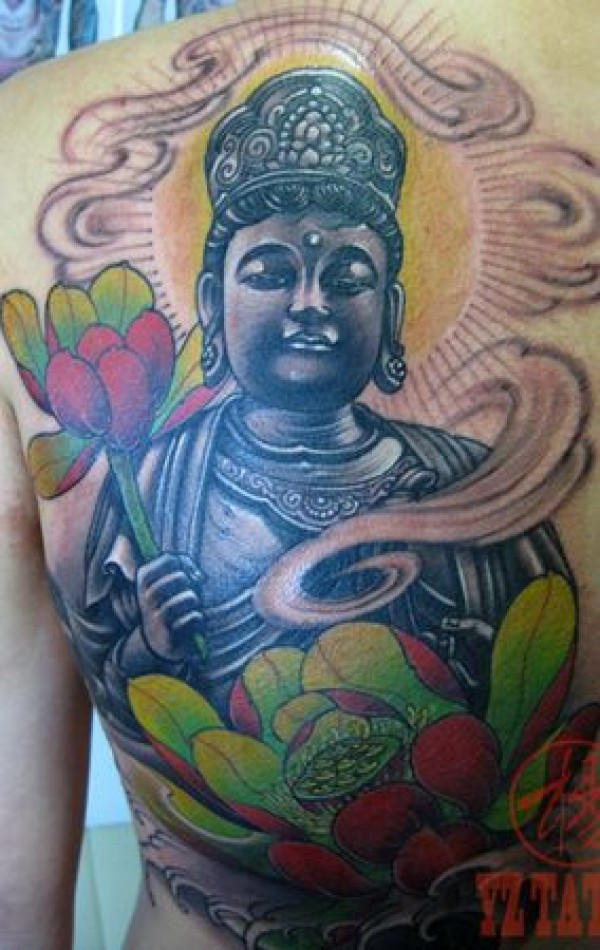 背部彩色观音莲花纹身图案纹身图片_宗教纹身图案大全_纹身图吧