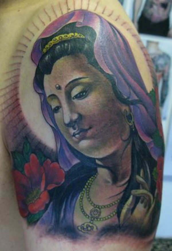 手臂彩色观音牡丹花纹身图案纹身图片_宗教纹身图案大全_纹身图吧