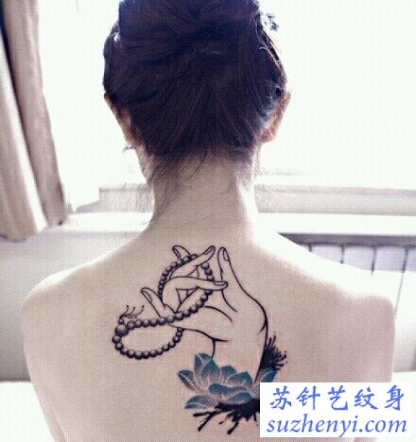 女孩背部手拿佛珠纹身_宗教纹身图案大全_纹身图吧