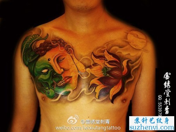 前胸佛头与莲花纹身_宗教纹身图案大全_纹身图吧